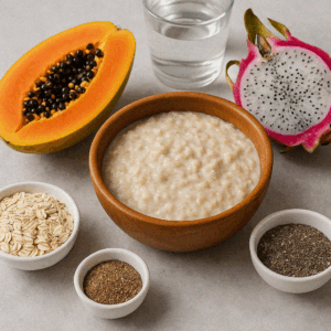 - Desayuno: Avena + papaya + chía hidratada.