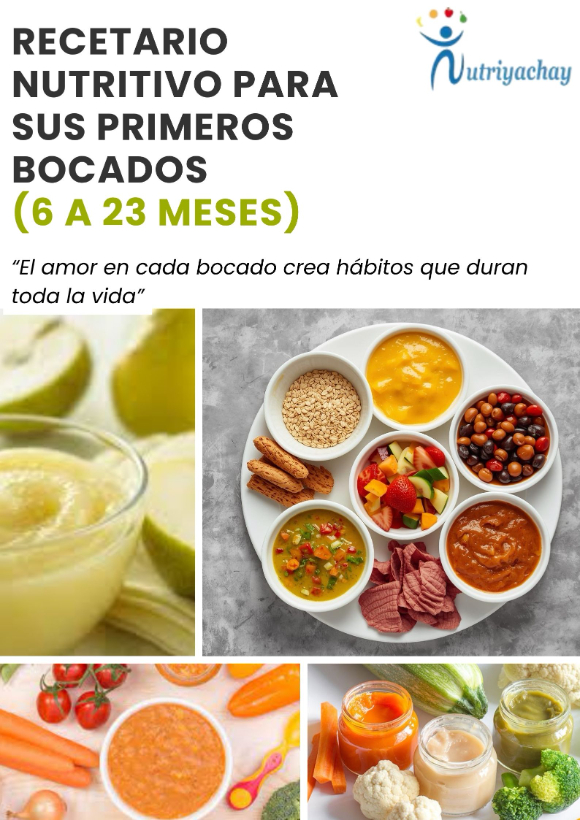 Este recetario ha sido creado para ayudarte en el proceso de alimentación complementaria desde los 6 hasta los 23 meses. Incluye preparaciones suaves, coloridas y fáciles de preparar, pensadas para estimular el gusto, la masticación y la aceptación de nuevos alimentos de forma natural y progresiva. Cada receta aporta nutrientes esenciales como hierro, proteínas, vitaminas y minerales, necesarios para el óptimo crecimiento del bebé. Es un material práctico, claro y lleno de amor que busca convertir el momento de comer en una experiencia feliz, segura y nutritiva para toda la familia 💚.